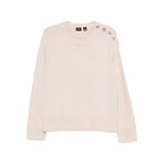 beige button embellishment shoulder round neck long sleeves ribbed hem Wool and cotton sweater