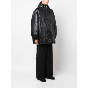 Cassandre Anorak oversized hooded coat from SAINT LAURENT featuring jet black, padded design, glossy finish, embroidered logo to the rear, slouchy drawstring hood, half front zip fastening, two side welt pockets, drop shoulder, long sleeves, elasticated cuffs and drawstring hem. Nylon blouson Size and Fit - This piece fits true to size. We recommend you get your regular size. Model is 1,84m / 6ft 1in wearing size 48 (IT)