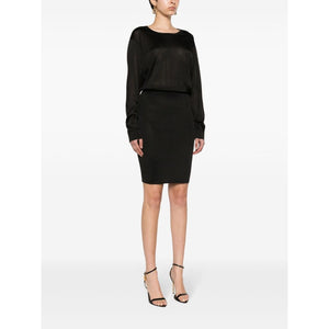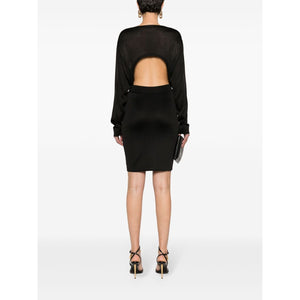 black knitted construction semi-sheer construction boat neck open back drop shoulder long wide sleeves elasticated waistband fitted waistline pencil silhouette straight mid-length hem Open-back knitted dress Size and Fit - This piece fits true to size. We recommend you get your regular size. Model is 1,75m / 5ft 8in wearing size S