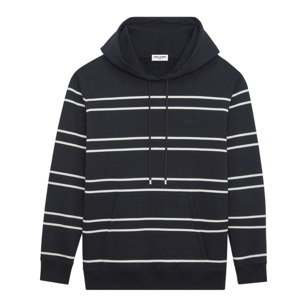 striped cotton hoodie from SAINT LAURENT featuring black, cotton, embroidered logo at the chest, horizontal stripe pattern, drawstring hood, long sleeves, front pouch pocket and ribbed cuffs and hem. Striped cotton hoodie Size and Fit - This piece fits true to size. We recommend you get your regular size. Model is 1,84m / 6ft 1in wearing size M