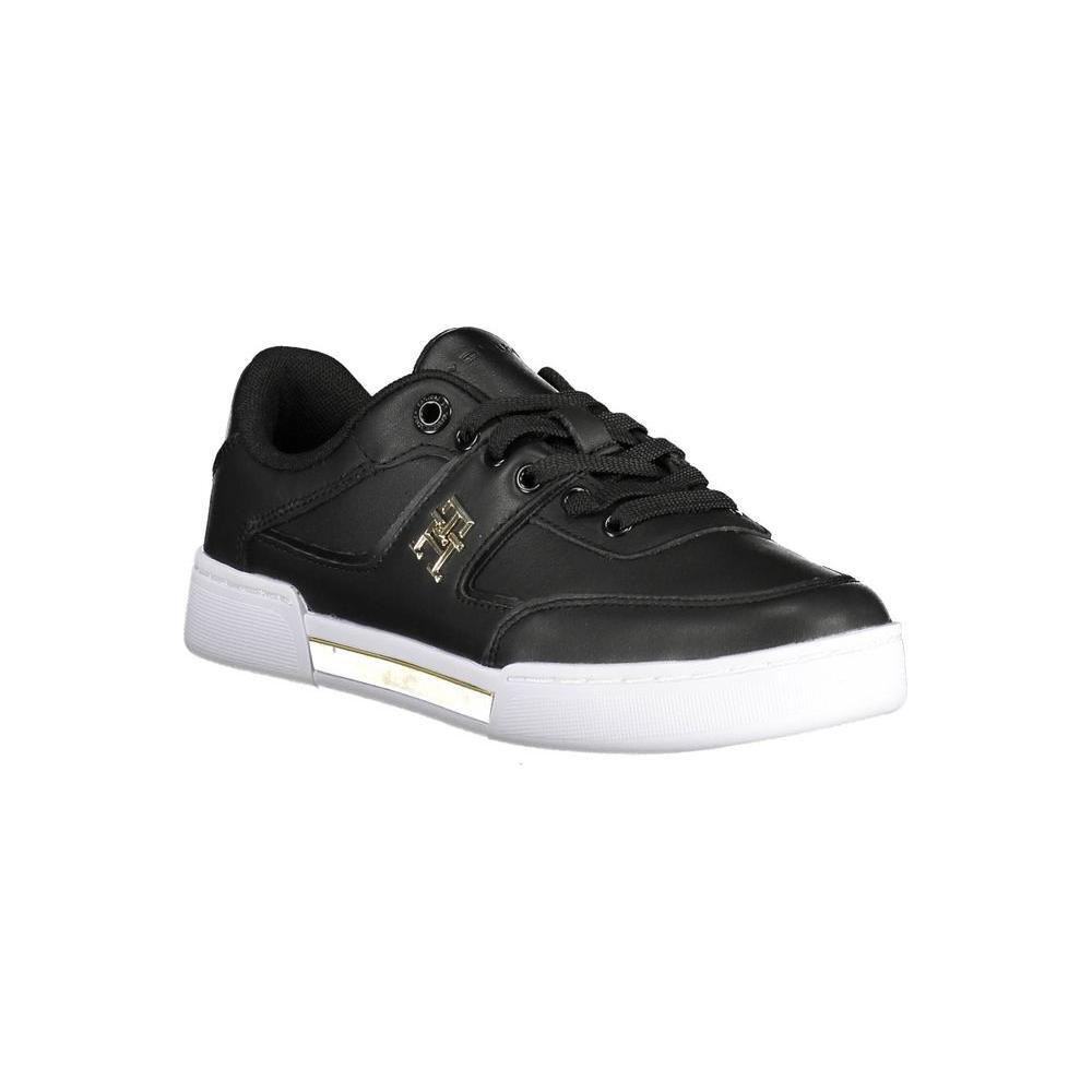 Elevate your athleisure ensemble with the epitome of sports-chic – Tommy Hilfiger’s lace-up sneakers. These shoes are a fusion of style and sustainability, crafted with a blend of 30% recycled polyester, 40% leather, and 30% polyethylene. Adorned with striking contrasting details and the iconic Tommy Hilfiger logo, each step reflects your eco-conscious fashion sense and love for the brand’s classic American cool aesthetics. Stride in confidence and make a statement in these black sneakers that blend comfort with a bold fashion-forward appeal.