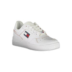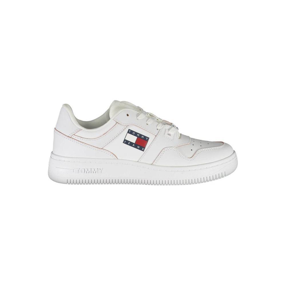Elevate your sporty chic aesthetic with a sleek edge in these Tommy Hilfiger sneakers. Crafted with sustainability in mind, they blend function with fashion, featuring a crisp white color adorned with contrasting details and the unmistakably preppy Tommy Hilfiger logo. Made for the eco-conscious trendsetter—50% recycled polyester meets a mixed material composition—stride ahead with a light footprint and unwavering style. A nod to both comfort and design, lace up and step out with confidence.
