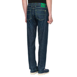 Elevate your denim game with Tramarossa’s impeccably crafted high-tailored jeans. Meticulously designed in Italy, these regular fit, blue jeans are accentuated by unique green stitching and a dazzling green button that confidently proclaims boldness. The eye-catching bright green suede patch, adorned with a metallic logo, adds a touch of luxury to the classic five-pocket design. Made from a comfortably slight stretch cotton, they are a testament to fashion-forward craftsmanship.