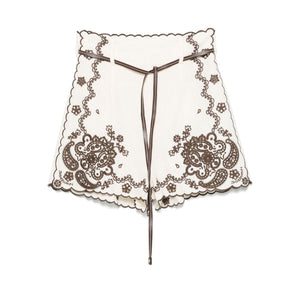 light beige concealed rear zip fastening belt loops detachable waist belt scallop edge Ascension embroidered linen shorts Size and Fit - This piece fits true to size. We recommend you get your regular size. Model is 1,75m / 5ft 8in wearing size 1 (NUM)